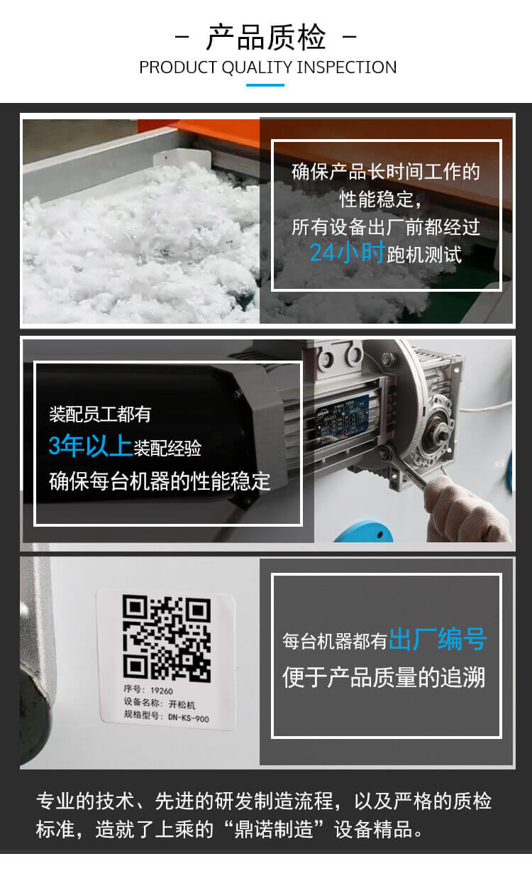 1、適用于開(kāi)松3~15D化纖原料。通過(guò)風(fēng)機(jī)噴棉充裝枕芯、靠墊、坐墊等,安全可靠,均勻飽滿、外形美觀。