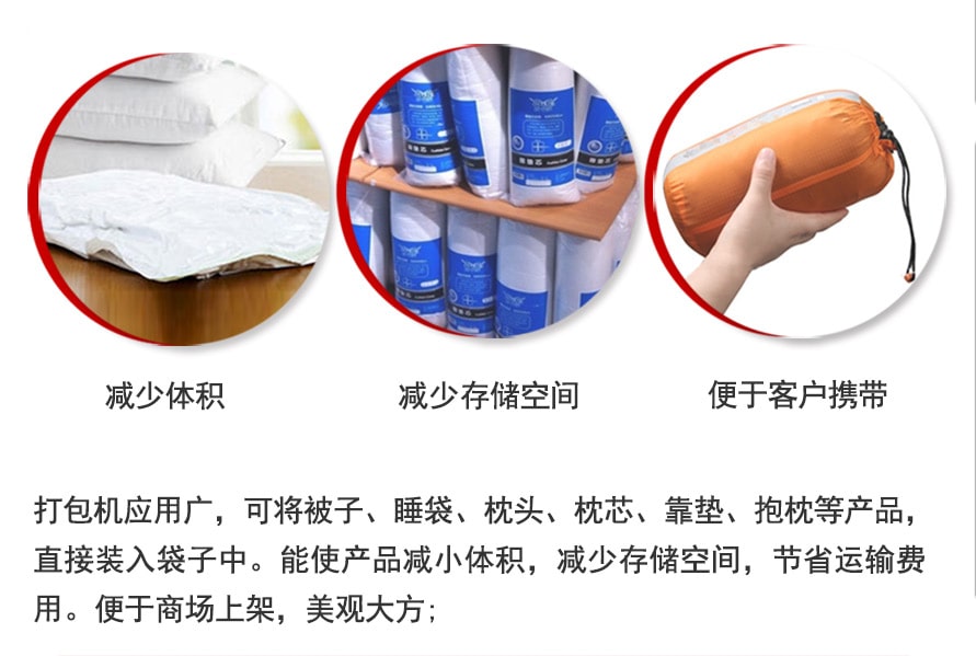 縮小包裝空間,減小體積,節(jié)省運(yùn)輸成本達(dá)70%。壓縮后的產(chǎn)品不改變物品外形,平整美觀,防潮防塵。